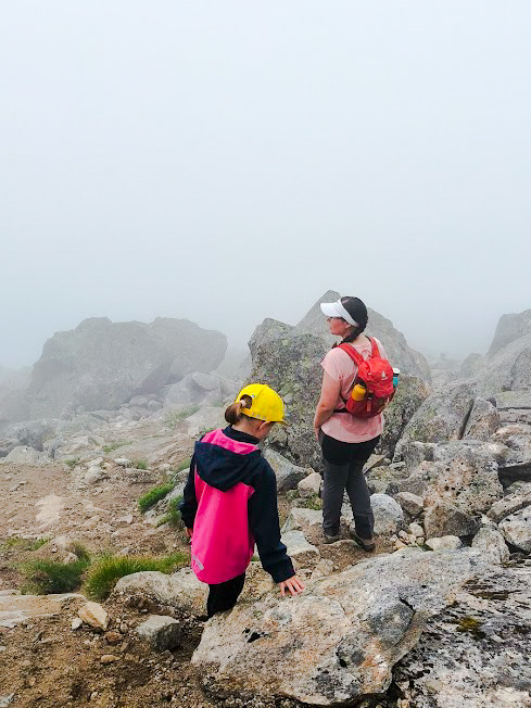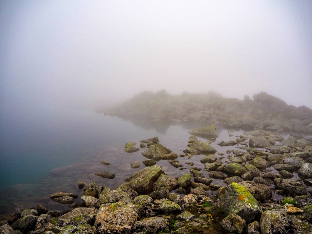 Me sen sijaan olimme tiheässä vitivalkoisessa usvassa, jossa Svartvatnetkin löytyi vain kartan perusteella etsimällä, koska järvi hukkui usvaan täysin näkymättömäksi jo 20 metrin etäisyydeltä rannasta. Lopulta järvi kuitenkin löytyi ja vaikka selkämykset valuivat hikeä rankan nousun ja kostean ilman vuoksi, ei tehnyt mieli pulahtaa virkistävälle uinnille Svartvatnetiin, koska järven rantoja ympäröi lumi ja jääpeite, vaikka kalenteri näyttikin heinä-elokuun vaihdetta. Niinpä istuimme järven rannalle kiven lohkareelle syömään välipalat ja katselimme usvaiselle jäätikköjärvelle, josta näimme vain edessämme olevan rantaviivan ja kaikki muu maisemasta peittyi tiheään sumuun. Maisemat jäivät siis täysin piippuun ja ei tarvinnut lapsiperheenä edes harkita sitä vaihtoehtoa, lähtisimmekö vielä etenemään kohti Fortoppia.