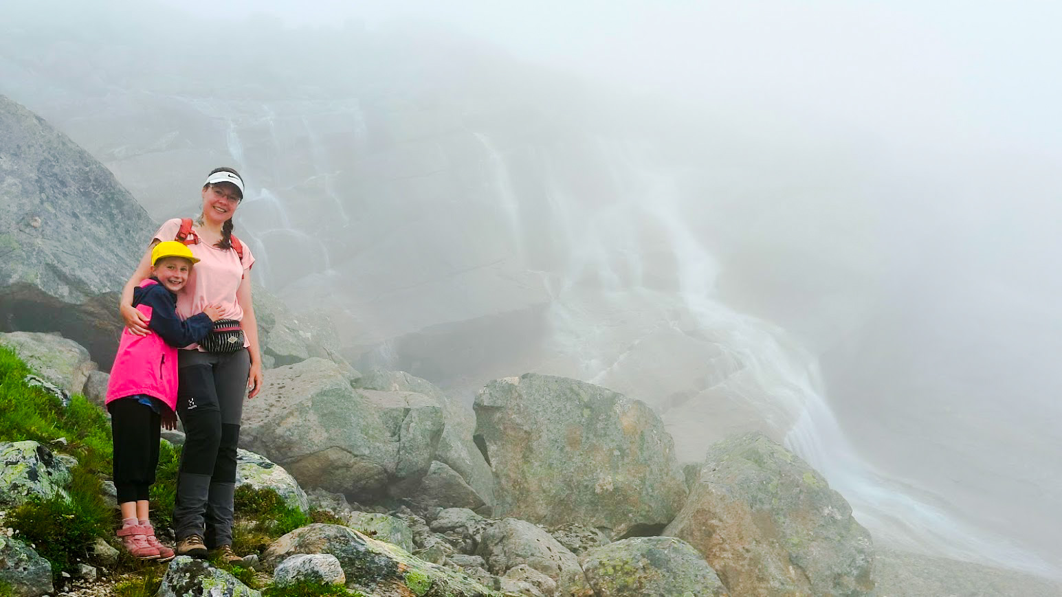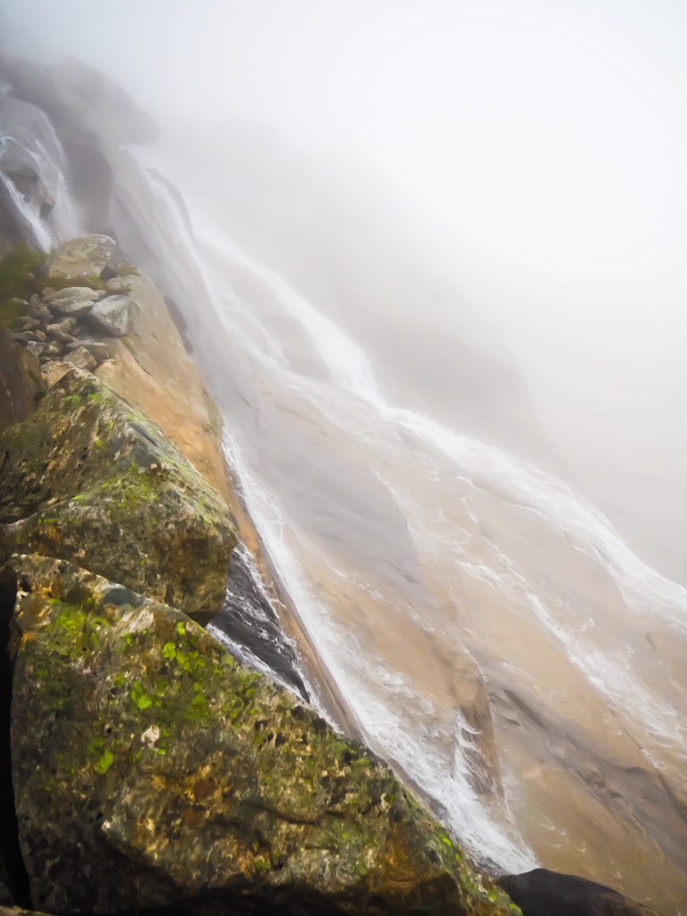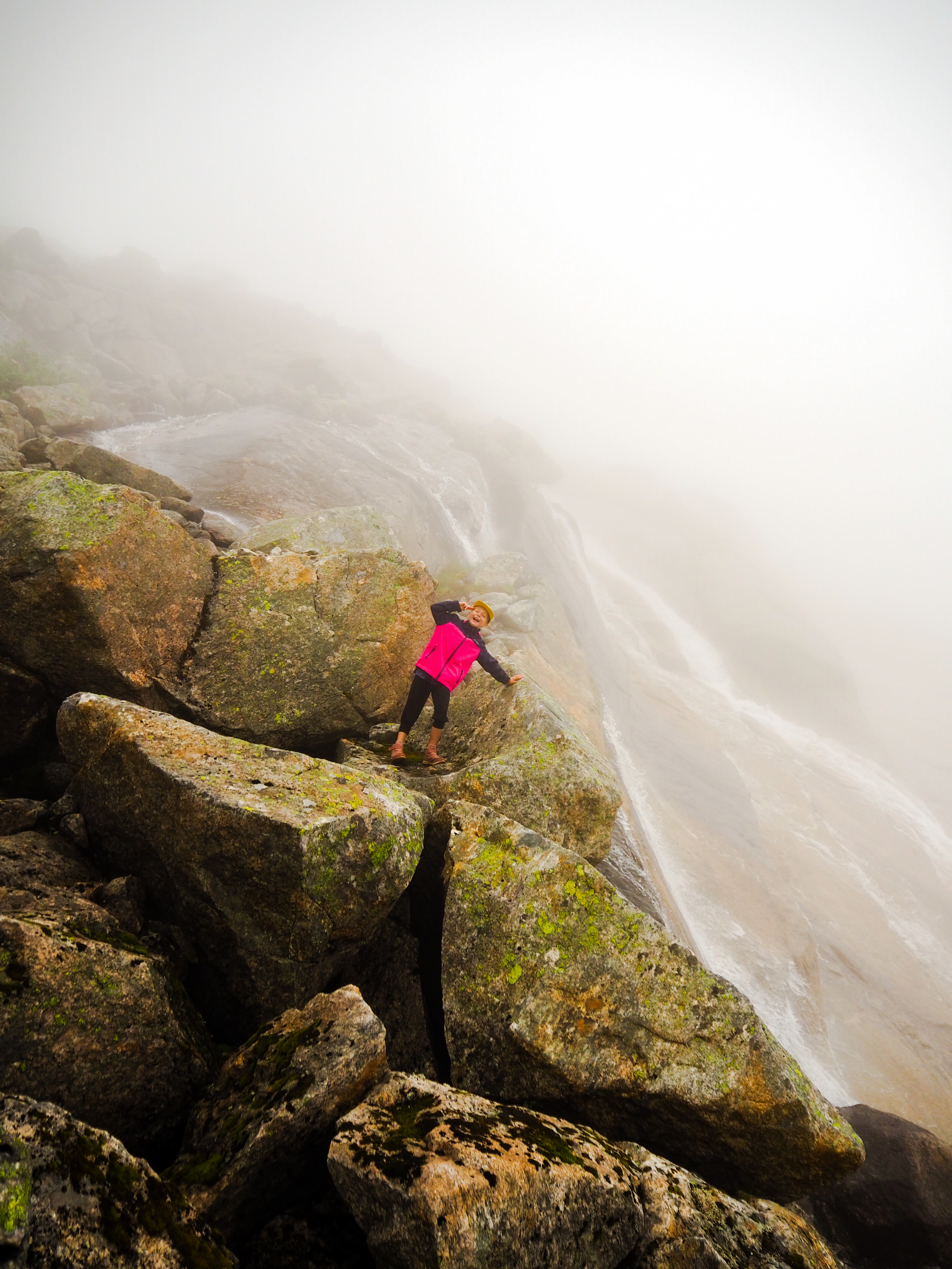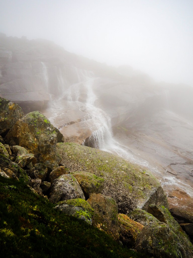 Upeat vesiputoukset virtasivat Svartvatnetilta alas vuoren rinnettä ja antoivat esimakua järvestä, vaikka järvi ei vielä näkynytkään. Pilvet roikkuivat kuitenkin niin alhaalla, että maisema meni aivan valkoiseksi jo hyvin pian puuttoman alueen alettua. Tiesimme siis kiivetessämme, että järvellä maisemia emme tulisi näkemään, vain valkoista mystistä usvaa pilven sisällä. Päätimme kiivetä järvelle silti, kun olimme tänne asti tulleet.